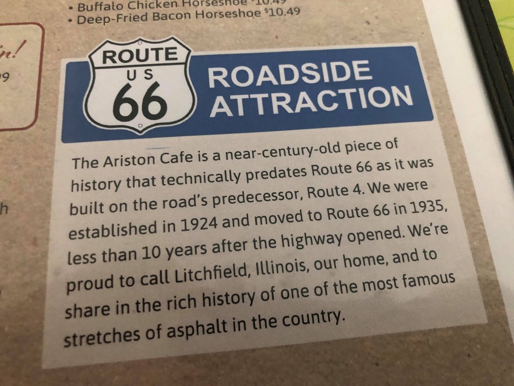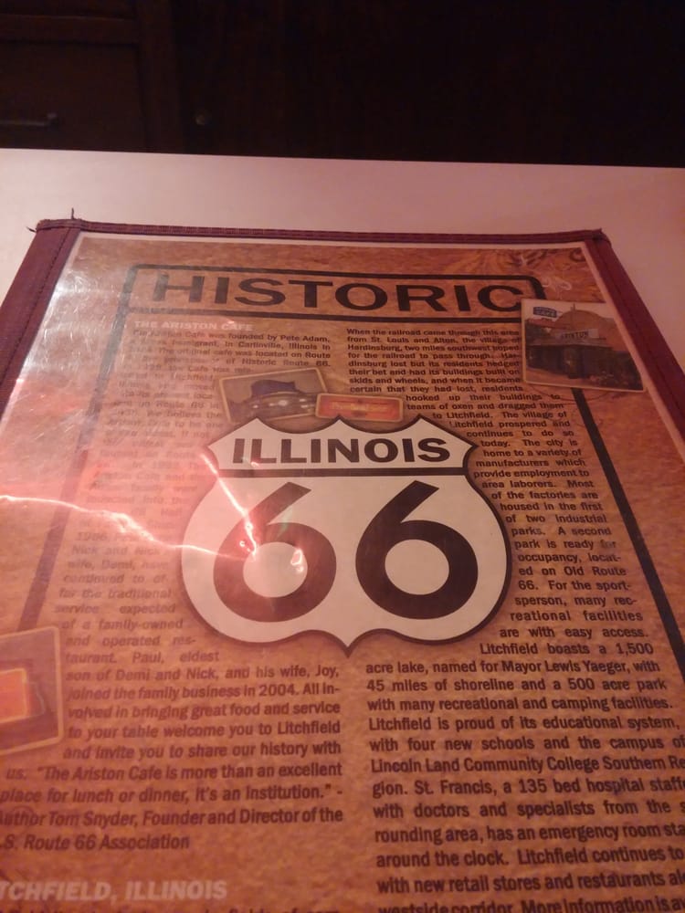 The Ariston Cafe, located in Litchfield, IL, offers a classic American dining experience with a Route 66 vibe. Customers rave about the perfect atmosphere, delicious food, and outstanding service. The menu features all the classic dishes you could want, with generous portions that often result in leftovers to take home. The cafe has been serving guests since the 1920s, maintaining its old diner feel with traditional black and white attire for the staff. Whether you're looking for a pork loin sandwich or a salad bar, the food is always delicious. The servers are attentive, knowledgeable, and personable, ensuring a wonderful dining experience. Don't miss out on this historic gem during your travels along Route 66.